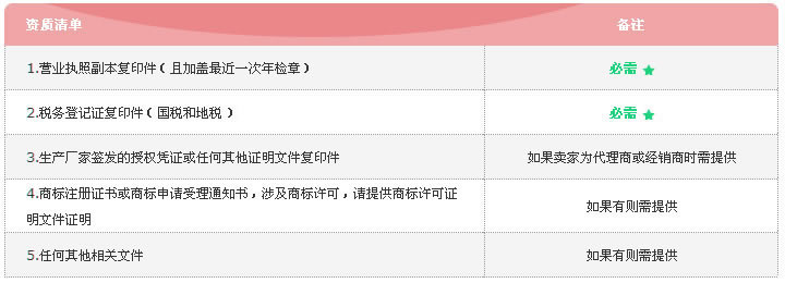 1.請(qǐng)準(zhǔn)備好所有要求的資質(zhì)材料復(fù)印件并加蓋貴公司公章。請(qǐng)根據(jù)賣家平臺(tái)提示上傳要求的所有資質(zhì)的電子文檔。 2.請(qǐng)確保您提供的所有信息、材料完整、準(zhǔn)確、及時(shí)、清晰。 3.網(wǎng)上商城可能根據(jù)中國法律規(guī)定或其政策不時(shí)要求您提供更多的資質(zhì)證明材料。 4.網(wǎng)上商城客服隨時(shí)解答您任何疑問,提供全方位技術(shù)支持。
