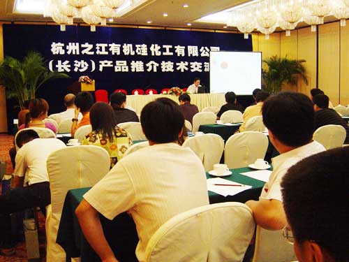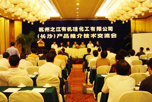 2005年7月20日杭州之江有機硅化工有限公司在長沙通程國際大酒店召開了產品推介及技術交流會,這次會議得到了行業內諸多領導、專家、當地領導和幕墻公司的鼎立支持,到會的有中國建筑金屬結構協會鋁制品幕墻委員會黃圻主任;中國建筑裝飾協會鋁制品委員會宋協昌主任;中國建筑制品與構配件產品標準化技術委員會顧泰昌秘書長;湖南省政協常委杜遠明先生;湖南省建設廳建筑業處彭國安處長;長沙市建委楊志堅主任;長沙電視臺新聞頻道、《瀟湘晨報》、長沙晚報三家當地主流媒體的記者。參加會議的還有來自湖南地區的幕墻公司、裝飾公司、檢測站、設計院、玻璃深加工企業等,通過這次會議各方對之江品牌的有了一個更加清晰的認識。