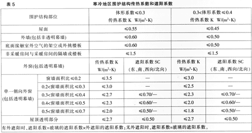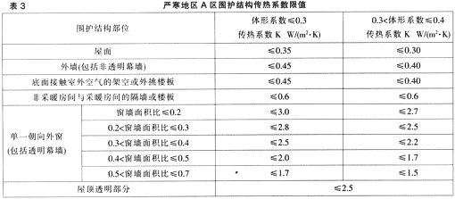 表3、表4、表5給出了嚴寒地區和寒冷地區對于建筑物的體形系數和傳熱系數的極限要求。