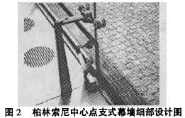 2.2 圖2為德國柏林索尼中心點支式幕墻細部設計,該中心是索尼公司在歐洲的總部。各種構造形式的使用使該建筑成為波茨坦廣場上的一個明星建筑。在幕墻的下端設計了自動窗,配合該建筑通風系統,在必要時開啟,形成正壓或負壓的空氣流,從而達到補充和交換新鮮空氣的功能。