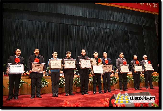 圖十一 保濕裝飾類獲獎(jiǎng)企業(yè) 北京鼎盛新元、寧夏清華園等企業(yè)代表上臺(tái)領(lǐng)獎(jiǎng)