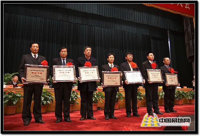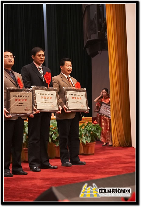 圖十七 建筑幕墻類 獲獎(jiǎng)企業(yè)廣州白云、北京江河、深圳三鑫企業(yè)代表上臺(tái)領(lǐng)獎(jiǎng)