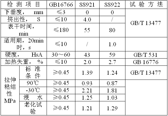 從表中的數據可以看出:SS921、SS922結構密封膠的性能指標遠遠優于國家GB 16776建筑用硅酮結構密封膠的標準。