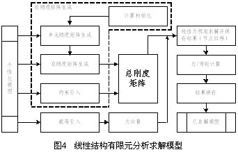 剛度矩陣或柔度矩陣。(3)裝配總剛度矩陣或柔度矩陣。(4)求解大型線性方程組。(5)計算各單元的應力和位移。(6)結果保存。線性結構有限元分析求解模型如圖4所示。