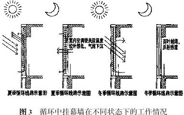 事實上每個幕墻構造的具體做法都涉及當地的氣候條件。圖2 為筆者實際作品的一個例子,當時稱之為假性幕墻。由于當地屬嚴寒地區,只在內層設置通風口,也就是只有冬季循環,但其全年日照時間很長,夏季日照時數還是較大,中掛百葉也是解決問題的一種方案。但對于長江中下游夏熱冬冷地區,雙路循環則是必須的。只有這樣才能兼顧冬夏兩季室內環境的要求。綜合不同方案的優點,可以得出循環中掛百葉幕墻(簡稱中掛幕墻) 的構造,圖3 為中掛幕墻在不同狀態下的工作情況示意,仍然是一種定性的理解,下面就應對其做定量的分析。