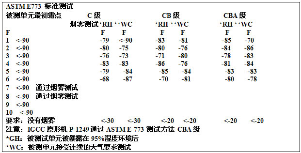 美國檢測和材料協會(ASTM)已經為中空玻璃制定了統一標準尺寸、單位數量、檢測時間和性能要求。ASTM E773是一種檢測密封條的耐用性的標準。ASTM E774是根據在各種氣候條件下檢測的耐用性將中空玻璃分成三種。當各種循環的數字出來時,把標本移走結霜點就獲得了。標本會被分成三類Class C,Class CB,Class CBA,最后一種是最高等級。每個中空玻璃生產廠家都會做產品檢測,Warm-light已在各種安裝形式下作了檢測并成功地獲得了CBA等級。