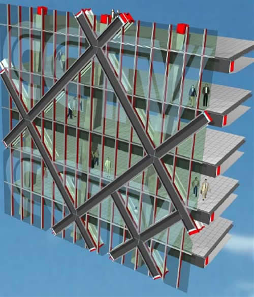 央視新廈是對傳統高層建筑的一種顛覆與創新,也是對近一百年的高層建筑史反思的結果。“高層建筑產生了一百多年,數量越來越多,層數越來越高,但是創造性卻越來越貧乏,央視新廈并不是一個簡單的摩天大樓,它區別傳統的摩天樓。傳統的摩天大樓核心筒是分散的,每一個中間的核心筒服務于周圍這一圈,越到上面越小,這是一個約定俗成的原則。但是,在央視摩天大樓里,它不是一個管狀的東西,它是一個環,從概念上顛覆掉了人們對摩天樓的傳統認識。從這個意義上來講可理解為‘反建筑的建筑’。央視新廈的結構是可行的、也是可建的,它具有標志性力量和高效、靈活的特點,是高層建筑創新和突破。