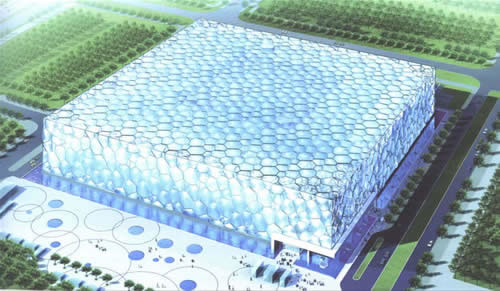 國家游泳中心確定 “水立方”構造 。水是整個建筑的主題,設計師希望人們通過這個建筑能體會與水有關的種種快樂:流動、多變、不確定、寧靜、奔涌、潮起潮落……水的流動、多變和不確定性給人們不同的體驗。當你靜靜地站在遠處觀看時,可能感覺它只是個立方體,但當你走近時,你會發現由許多特殊材料制成的“泡泡”氣枕。這個立方體的構造非常特別。