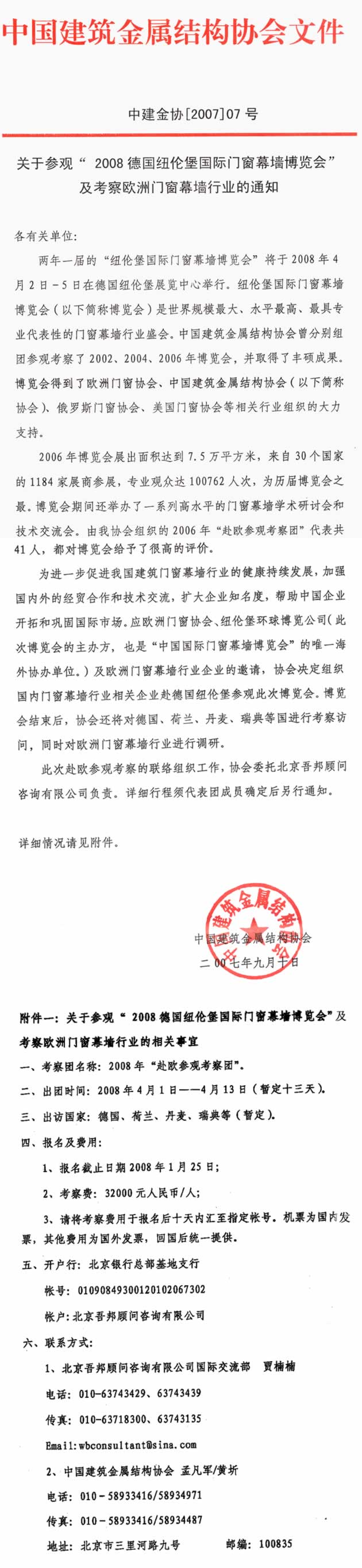 參觀“08德國紐倫堡博覽會”及考察歐洲門窗幕墻行業通知