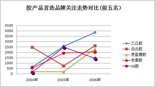 2006年是膠類產品市場群雄并起的一年,從關注度上看,膠類產品市場的品牌關注度較集中,之江、思藍德與白云三大廠商的表現突出,三者的關注比例均在10個百分點以上,累計關注比例占據整體市場近60%的關注份額。