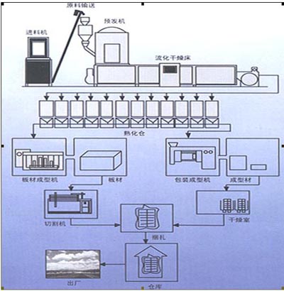 EPS 加工一般都經過預發泡、(預發機)圓熟、成型、(板材機)產品熟化這幾道工序。(流程圖)