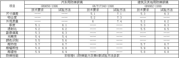 耐熱性、耐輻照性、耐濕性、防彈性能:建筑及其他用防彈玻璃性能有:尺寸偏差、外觀質量、厚度、透射比、