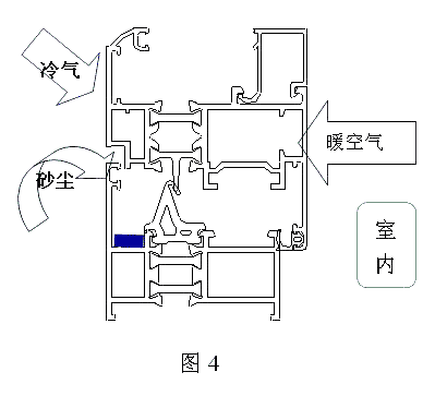 見(jiàn)圖3、圖4由于等壓腔與外界完全開(kāi)放,在華北及西北地區(qū)使用的實(shí)際情況,可以看到使用過(guò)程中易形成的積塵和污垢難以清理。改進(jìn)的目的有兩個(gè):一是增加密閉式等壓腔,以減少塵垢淤積;二是因密閉式等壓腔的建立形成了一個(gè)有效的過(guò)渡腔室,使內(nèi)外空氣溫度形成階段過(guò)渡,提高其保溫隔熱性能。為了極大地增強(qiáng)節(jié)能性能,將排水腔設(shè)置為暗排水。我們都知道塑料平開(kāi)窗的節(jié)能性能高于隔熱鋁斷橋門(mén)窗,就其原因一是塑料型材固有的低傳導(dǎo),二是密閉式等壓腔的存在,將外界的影響降到最低點(diǎn),從而提高節(jié)能性能。等壓腔密閉后為了順利排水,必須設(shè)置氣壓平衡孔。氣壓平衡孔分為暗通式和直通式,建議均采用暗通式。在解決塵垢淤積的同時(shí),門(mén)窗的節(jié)能性能必定也有所提高。從﹙圖4﹚可以看出由于增加了一道密封,在冷空氣襲來(lái)時(shí)大部分被阻擋于外,只有少部分通過(guò)型材、排水孔、氣壓平衡孔、膠條傳導(dǎo)或經(jīng)過(guò)縫隙進(jìn)入?yún)⑴c冷熱交換,而這種交換必須經(jīng)過(guò)三個(gè)階段才能完成(室內(nèi)冷熱空氣析出也需經(jīng)歷此過(guò)程),故而形成了幾個(gè)不同的溫度帶,使冷熱交換減慢提高節(jié)能性能。為了較大幅度提高保溫性能應(yīng)在以下幾方面進(jìn)行改進(jìn)。