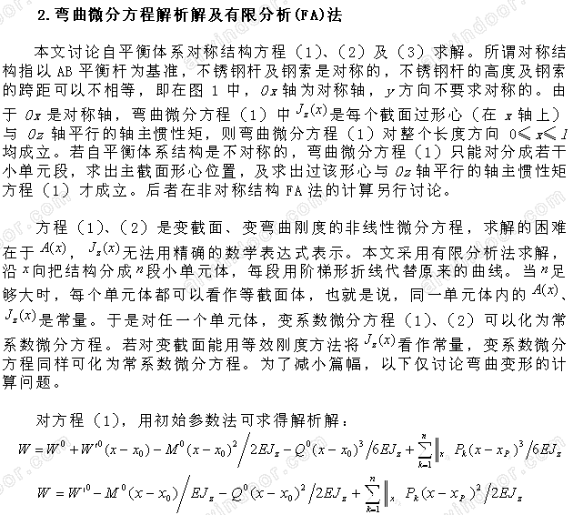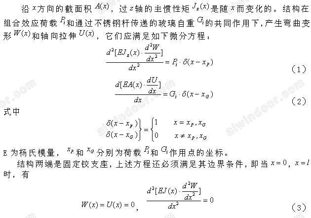 摘 要:本文闡述幕墻自平衡體系桿索結(jié)構(gòu),在風(fēng)荷載和地震荷載的組合載荷及玻璃自重荷載作用下產(chǎn)生彎曲及拉伸變形,建立變截面的彎曲和拉伸微分方程,用有限分析法導(dǎo)出結(jié)構(gòu)位移和內(nèi)力的方程式。通過連接條件建立傳遞矩陣化為數(shù)值解。研制工程應(yīng)用計算軟件。最后給出計算實(shí)例,計算結(jié)果與實(shí)驗值相同。