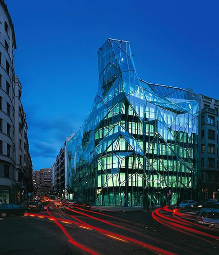 這是一座落成不久的建筑,位于西班牙的畢爾巴鄂。巴斯克衛生部總部大樓(Basque Health Department Headquarters),這座大樓位于當地兩條主要大街的交匯處,設計由 Coll-Barreu Arquitectos 一家年輕的建筑設計事務所完成的。總部大樓所處位置已有的建筑生態給設計帶來了很多制約因素,Coll-Barreu 就因勢利導,將新建筑和老建筑相融。建筑的表面使用了不規則的多邊形結構的玻璃幕墻,不規則的玻璃能夠將建筑四周的風景動態的倒影其中。