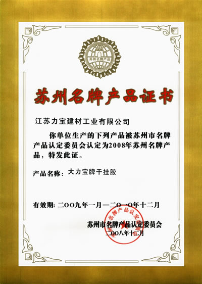 大力寶牌干掛膠榮獲蘇州名牌產品榮譽稱號