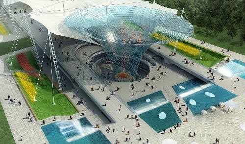 2010年上海世博會中央景觀道路“世博軸”進入全面施工階段,圖為首次公布的“世博軸”主出入口“陽光谷”造型效果。據介紹,“世博軸”的一端也是上海世博園區的主出入口,整個“世博軸”在入口及沿途共設6個巨型圓錐狀“陽光谷”。