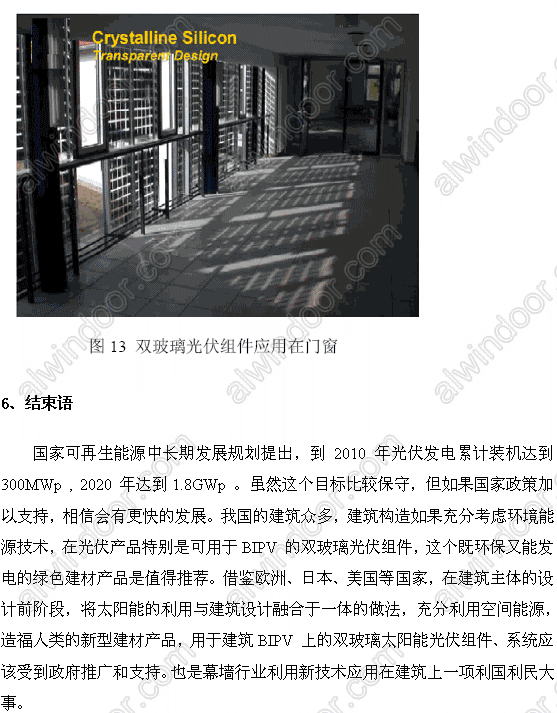 Abstract: Along with the “People’s Republic of China Renewable Energy Law,” implemented in 2006, then photovoltaic industry gradually infiltrate to the construction industry. The artivle introduced the integration of BIPV product ---double---glazed solar PV modules and made some suggestions to raise the BIPV photovoltaic industry.