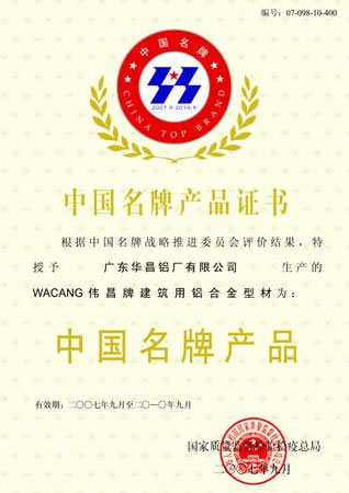 2007年9月11日國家質量監督檢驗檢疫總局在北京人民大會堂隆重舉行表彰大會,表彰2007年度榮獲“中國世界名牌”和“中國名牌”的企業。廣東華昌鋁廠榮獲 “中國名牌”稱號。這是廣東華昌鋁廠繼獲得“中國馳名商標”后又一次獲得的國內頂級榮譽,表明廣東華昌鋁廠的產品已經得到國家的充分認可。