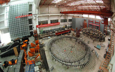 傳感器”,再連接到試驗(yàn)現(xiàn)場的兩臺計(jì)算機(jī)上。別看只有5道環(huán)索,因?yàn)橹虚g有鋼管相連,牽一發(fā)而動全身,每一步微小的調(diào)整都需要慎之又慎。之后分三次加重,動力靜力實(shí)驗(yàn)還要穿插進(jìn)行。一輪測試下來,至少要一個(gè)星期。