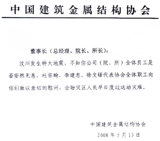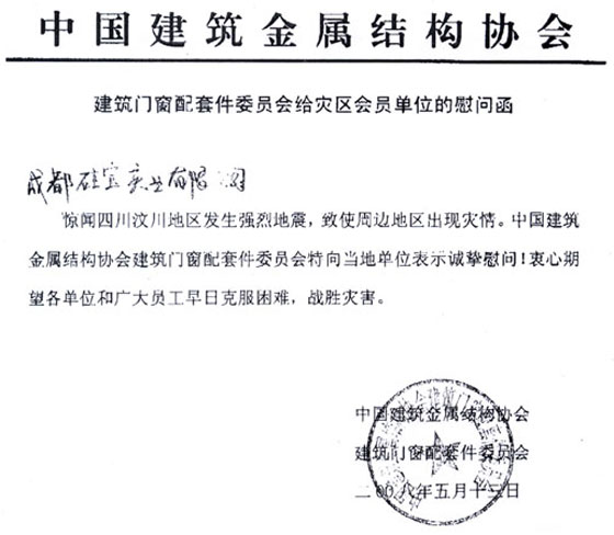 建筑門窗配套件委員會給災區會員單位的慰問信