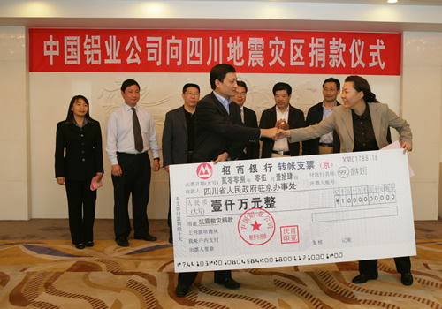 中鋁公司向四川地震災區捐款1000萬元