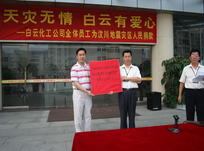 5月15日,白云化工組織了一場“天災無情 白云有愛 ”為地震災區募捐的活動,在民政局領導的見證下,白云化工公司共捐出價值三十萬元的液態雨衣及現金六萬元,而廣大員工亦紛紛慷慨解囊,現場籌得善款34413元。特別令人感動的是:當日來公司拜訪的幾位代理商、供應商亦主動捐了款。據悉目前價值三十萬元的液態雨衣已順利到達災區,送至災民手里。