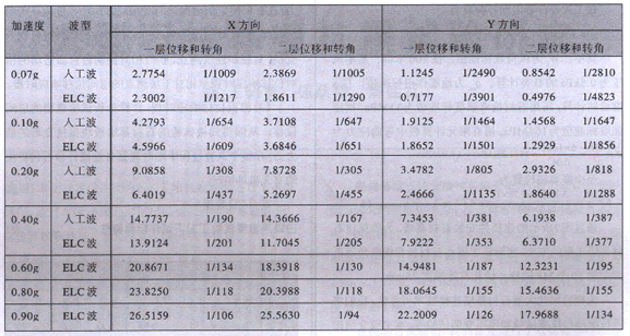 (2)試件在人工波和EL-Centro地震波作用下,最大加速度分別為a=70gal、100gal、200gal、400gal、600gal、800gal、900gal,相應(yīng)的層間相對線位移及角位移匯總后見表2所示。