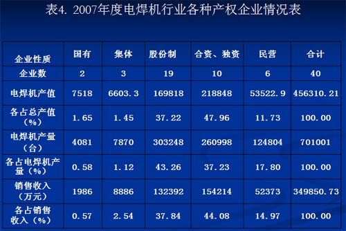改革開放以來,經過了一段時間的調整,我國電焊機行業的企業性質發生了很大變化,目前,非國有企業占了絕大多數。非國有資本為主的企業(含股份制、中外合資及外國獨資、民營企業)無論在產值、產量還是主營業務收入等方面都已達到或超過了總額的96%,以非國有資本為主的企業近年來迅猛發展,所建立的新機制更適應市場、更有活力,具有更強大的生命力和市場競爭力,我國焊接設備制造業已完全被激活。