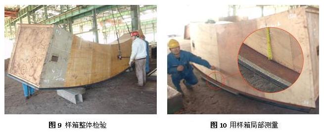 通過對其檢驗精度、工作效率、特別是對能否全程跟蹤檢驗及操作方面進行了綜合分析,決定采用傳統的樣箱檢驗法對彎扭鋼板加工質量進行檢驗(圖9、10)。