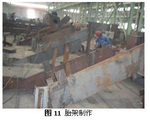 2)制作胎架 根據圖紙要求制作胎架,胎架模板的設置必須保證模板上口線形與構件表面外形的一致性并有效的增加構件焊接過程中抗焊接變形的臨時剛度;整個胎架制作完成后既要便于構件拼裝,又要便于在制作過程中對構件變形及精度的監控、測量。