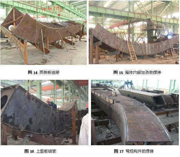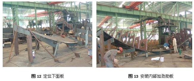 在胎架上定位下面板(見圖12),安裝箱體內部加勁肋板(見圖13),然后安裝兩側板(見圖14),焊接內部加勁肋板與下面板及兩側板的焊縫(見圖15),最后安裝上面板(見圖16)。