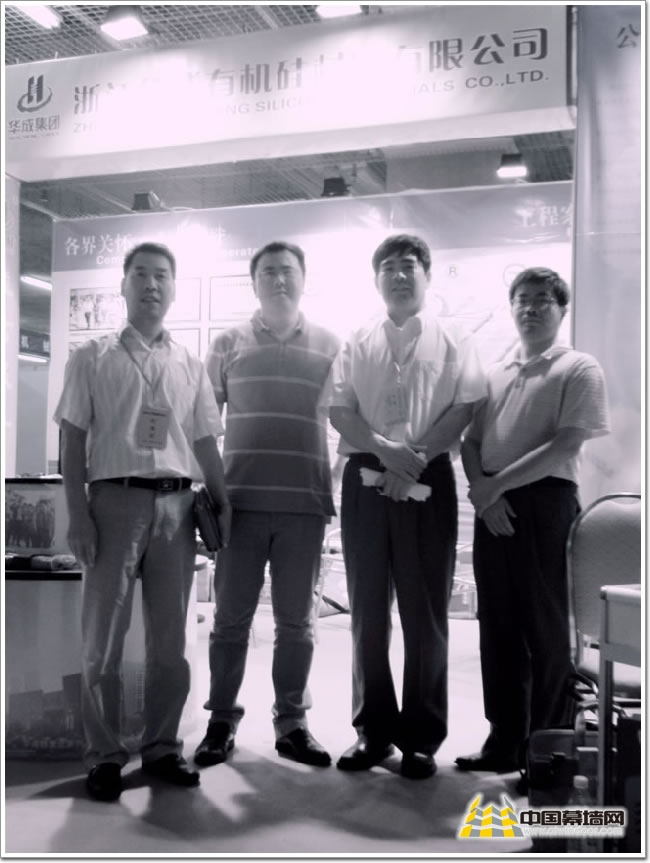 中國(guó)建筑玻璃與工業(yè)玻璃協(xié)會(huì)張佰恒秘書長(zhǎng)(右二)蒞臨展臺(tái)指導(dǎo)、浙江華成有機(jī)硅材料有限公司總經(jīng)理郭顯聰先生(左二)、副總經(jīng)理趙劍胤先生(左一)、技術(shù)總監(jiān)歐陽(yáng)煉先生(右一)
