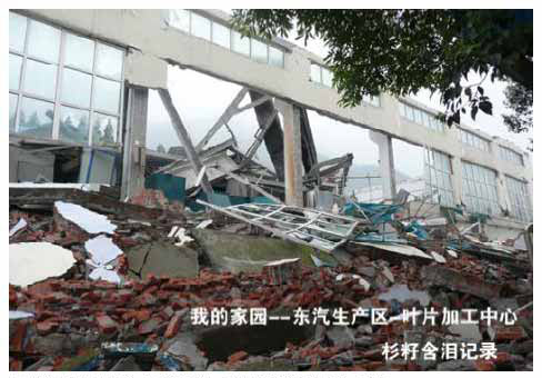 東汽裝備公司廠房,采光頂垮塌,廠房外側(cè)玻璃幕墻尚好。但相鄰另一廠房的外側(cè)玻璃幕墻破裂、脫落