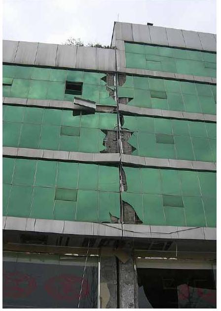 有些幕墻在建筑沉降縫處結構處理不當,要么板塊跨越沉降縫,要么間隙沒有留夠,從而造成此局部幕墻受到破壞
