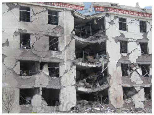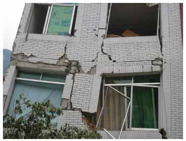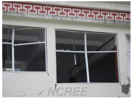 窗間墻體破壞,如果沒有構造柱及圈梁,估計垮塌了。由于構造柱及圈梁的作用,盡管震后此建筑也已是危房,但房中的人保命沒問題。窗框脫落也是迫不得己。窗間墻體破壞,推拉窗脫落