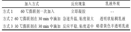 硅烷偶聯(lián)劑KH-550的化學名稱為γ-氨丙基三乙氧基硅烷,分子式為H2N-CH2-CH2-CH2-Si-(OC2H5)3,由于氨基是-NCO與-OH反應的催化劑,所以加入到體系中會加速-NCO與-OH的反應,若控制不當,則會引起爆聚,使反應體系凝膠。表3為KH-550的加入方式對APU乳液的影響。