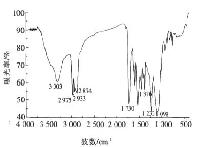 由圖1可知,3303cm-1處為N-H伸縮振動吸收峰,2975cm-1、2933cm-1、2874cm-1處分別為-CH3、-CH2和-CH的伸縮振動吸收峰,1730cm-1處為酯羰基吸收峰,而3480cm-1處的羥基峰和2270cm-1處的異氰酸酯特征峰消失,這些都表明了-NCO與-OH幾乎全部反應掉了。1098cm-1處為C-O-C吸收峰,1233cm-1處為環(huán)氧樹脂季碳原子的特征吸收峰,不受其他基團影響的環(huán)氧基在830cm-1左右也沒有出峰[5]。綜上所述,環(huán)氧樹脂參與了反應,而且其環(huán)氧基也全部發(fā)生了開環(huán)反應,從而達到了利用環(huán)氧樹脂改性的目的。
