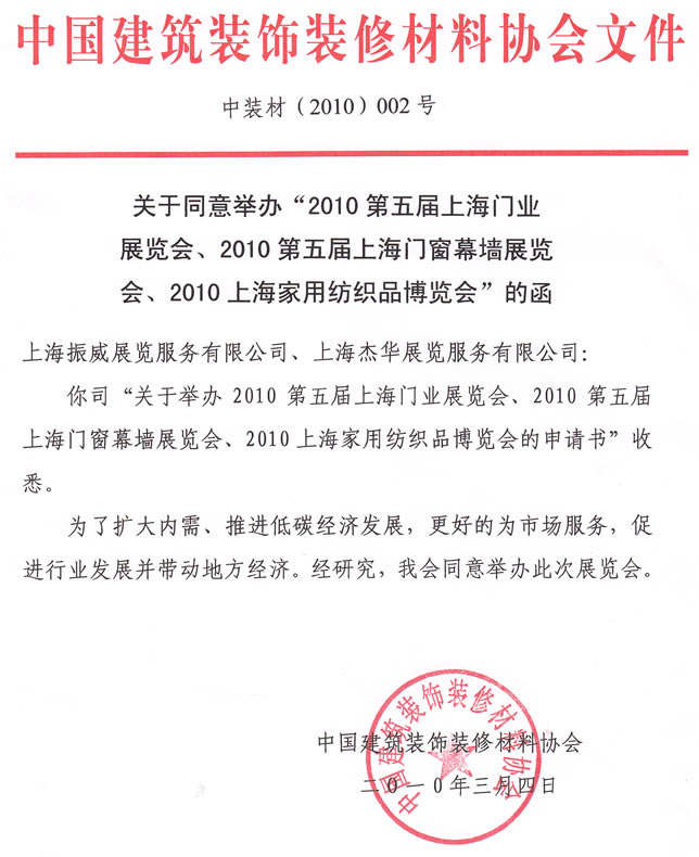 為了促進(jìn)我國(guó)門(mén)窗幕墻業(yè)市場(chǎng)的發(fā)展,由中國(guó)建筑裝飾裝修材料協(xié)會(huì)主辦、上海振威展覽服務(wù)有限公司承辦的“2010第五屆上海國(guó)際門(mén)窗幕墻展覽會(huì)”于2010年8月23日-8月25日在上海光大會(huì)展中心舉辦,展會(huì)期間將邀請(qǐng)國(guó)內(nèi)外經(jīng)銷(xiāo)商,建筑裝飾公司,房地產(chǎn)開(kāi)發(fā)商,建筑設(shè)計(jì)院,建筑裝飾材料生產(chǎn)商,進(jìn)出口商,施工管理單位,政府采購(gòu)部門(mén)是主要的邀請(qǐng)對(duì)象。國(guó)家組團(tuán)將是本屆招展工作的重點(diǎn)所在,我們將加強(qiáng)同海外相關(guān)協(xié)會(huì)及媒體的聯(lián)系,確定重點(diǎn)招商地區(qū),邀請(qǐng)更多的海外買(mǎi)家參與展會(huì)。