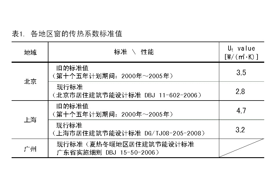 為貫徹執(zhí)行《民用建筑節(jié)能條例》,各地區(qū)政府陸續(xù)制定或修訂了居住建筑節(jié)能設(shè)計標(biāo)準(zhǔn)(北京市:《居住建筑節(jié)能設(shè)計標(biāo)準(zhǔn)》DBJ 11-602-2006,上海市:《居住建筑節(jié)能設(shè)計標(biāo)準(zhǔn)》 DG/TJ08-205-2008,廣州市:《夏熱冬暖地區(qū)居住建筑節(jié)能設(shè)計標(biāo)準(zhǔn)——廣東省實施細則》DBJ 15-50-2006)。建筑物門窗與墻壁、屋頂相比熱工性能相對較差,通過門窗的熱損失和太陽光總透射比對采暖、空調(diào)能耗有著非常大的影響。