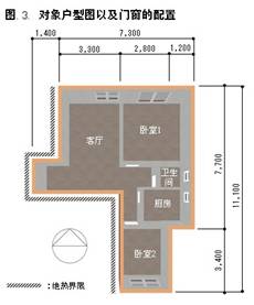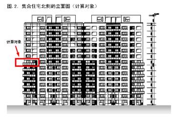 3.1計算對象 建筑物的北側(cè)立面圖由圖 2所示,以圖中圈出的八樓最外側(cè)的住戶為計算對象。平面圖和窗的配置參照圖 3,鄰戶以及樓梯間視為絕熱界限。圖 4表示從北側(cè)觀看的計算對象的立體圖。