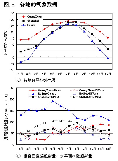 北京、上海、廣州在冬季1月份的三地平均室外氣溫的差異為10℃,到了夏季的7月,三地間差異只有5℃以下。年度垂直面直接照射量北京最大,相對的水平面擴散照射量北京最小。這是因為在北京,大氣中水蒸氣等直接擴散照射的物質(zhì)比其他地區(qū)都少的緣故。在上海,水平面擴散照射量在5~7月份最大,而廣州是在10~12月最大。