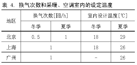 所有計算部位的外墻都看作是相同的,采用30mm擠塑泡沫塑料作為隔熱材料。通風(fēng)次數(shù)、采暖、空調(diào)能耗設(shè)定溫度遵從各個地區(qū)的居住建筑節(jié)能設(shè)計標(biāo)準(zhǔn)。設(shè)定值參照表 4。在這里設(shè)定凌晨0點到 5點;工作日的9點到17點時間段空調(diào)不運行。