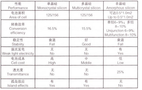 1.1基本概念 a、光伏電池 太陽能電池是利用光電轉換原理使太陽的輻射光暹過半導體物質轉變為電能的一種器件,這種光電轉唉過程通常叫做“光伏效應”,因此太陽能電池又稱為“光伏電池”。 商業化的光伏電池主要有單晶硅,多晶硅和非晶硅三種。三種光伏電池的性能比較如表