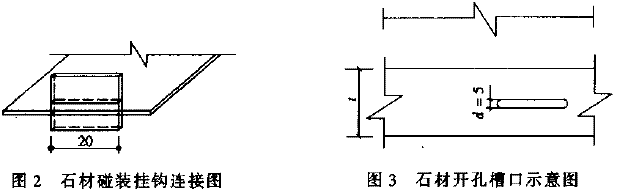 環氧樹脂注滿槽坑,平穩抬起石板,將槽口對準已固定在橫梁上的扣件緩緩插人,再將另一對扣件插人上部槽內,使石板稍向前傾,令扣件掛上橫梁后,再讓石板恢復到垂直狀態,并將扣件向下壓實,檢查調整石板的垂直水平進出位置,使其符合立面控制線。如圖5所示。