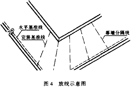 根據土建提供的測量基準點構成的線控制網示意圖,以測量基準點坐標為基準,采用天頂法利用激光經緯儀、鉛垂儀垂直測量,并傳遞至各樓層,在于各層樓面重新測設井字形線控制網,然后將各層井字形線控制網平移至外梁上,作豎向測點聯結,即可建立垂直基準線并由此可構成立面控制網。將立面控制網平移至立面外墻,確定各樓層的墻面位置并做好標記,各層立面以此標記為準,采用鋼絲線確定立面位置(圖4)。
