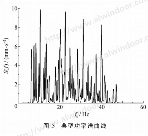 將通過H P3502A測到的結(jié)果數(shù)據(jù)文件導(dǎo)入計(jì)算機(jī),先經(jīng)L IF軟件轉(zhuǎn)為D0 S文件,然后通過63T0SDF軟件轉(zhuǎn)換為SD F文件,最后用V正W DATA軟件讀取數(shù)據(jù)文件,根據(jù)每種工況的結(jié)果選取如圖5所示的典型功率譜曲線(縱坐標(biāo)S (f)為加速度功率譜有效值開方取對數(shù)處理后的值,橫坐標(biāo)f5為分析帶寬頻率)進(jìn)行分析,提取索網(wǎng)的前三階自振頻率。