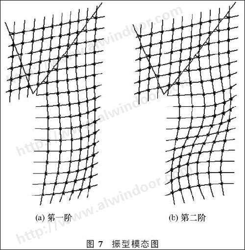 2)安裝玻璃后結(jié)構(gòu)的頻率迅速降低,這是由于玻璃的存在,結(jié)構(gòu)的剛度和質(zhì)量同時(shí)增長,但玻璃質(zhì)量的影響超過了其剛度的作用,導(dǎo)致整個(gè)結(jié)構(gòu)的頻率下降。