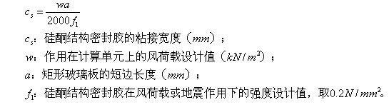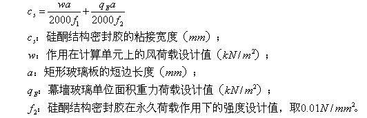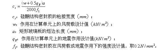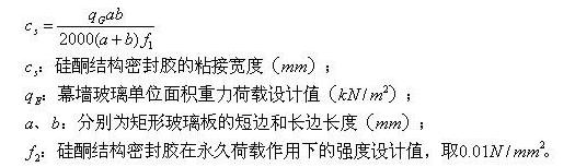 3. 豎向隱框、半隱框玻璃幕墻中玻璃和鋁框之間硅酮結(jié)構(gòu)密封膠的粘接寬度,非抗震設(shè)計(jì)時(shí),可取第a、c款計(jì)算的較大值;抗震設(shè)計(jì)時(shí),可取第b、c款計(jì)算的較大值。