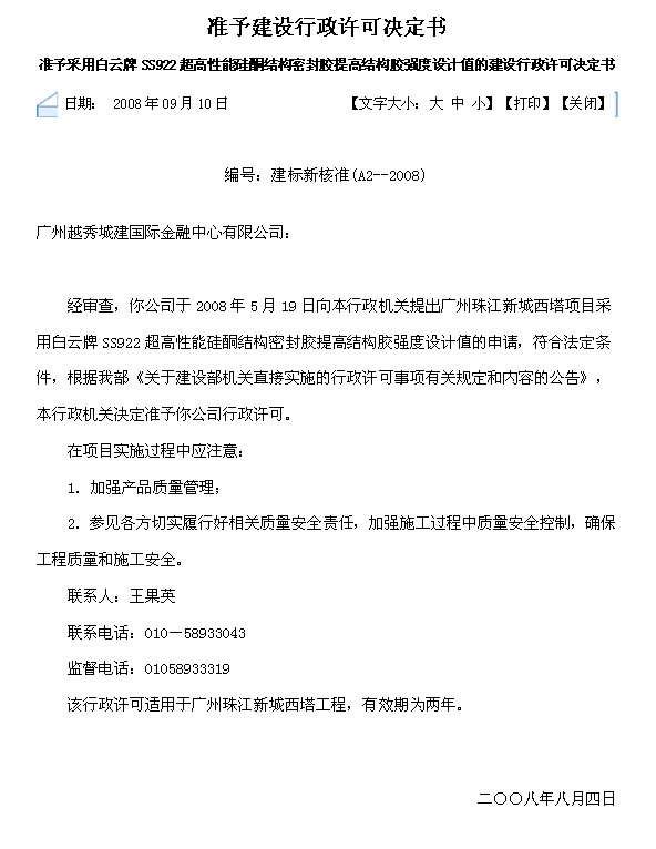 3、白云牌SS922超高性能硅酮結(jié)構(gòu)密封膠能夠滿足廣州珠江新城西塔項(xiàng)目主塔外幕墻的設(shè)計(jì)要求。
